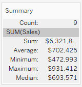 Ever wonder where the summary is for all those numbers in your view? There's a quick way to do that in Tableau. One way to do this is to right click in your sheet on an empty area, go to Summary, and it will show you the summary card. If you click on the top right corner where a down arrow will show, you can select other options too.