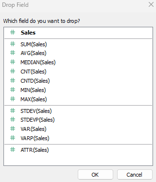 Instead of dragging and dropping a field to a shelf, clicking the dropdown arrow, then choosing measure, we can do right click drag. Right click and drag the field onto a shelf for quick aggregations.