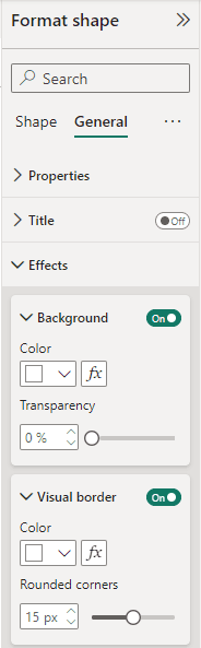 2. Head to General in the Format shape pane. Under Effects, turn the Background on, and turn Visual border on. Make sure the colour is the same colour as your background. Increase Rounded corners to 15.