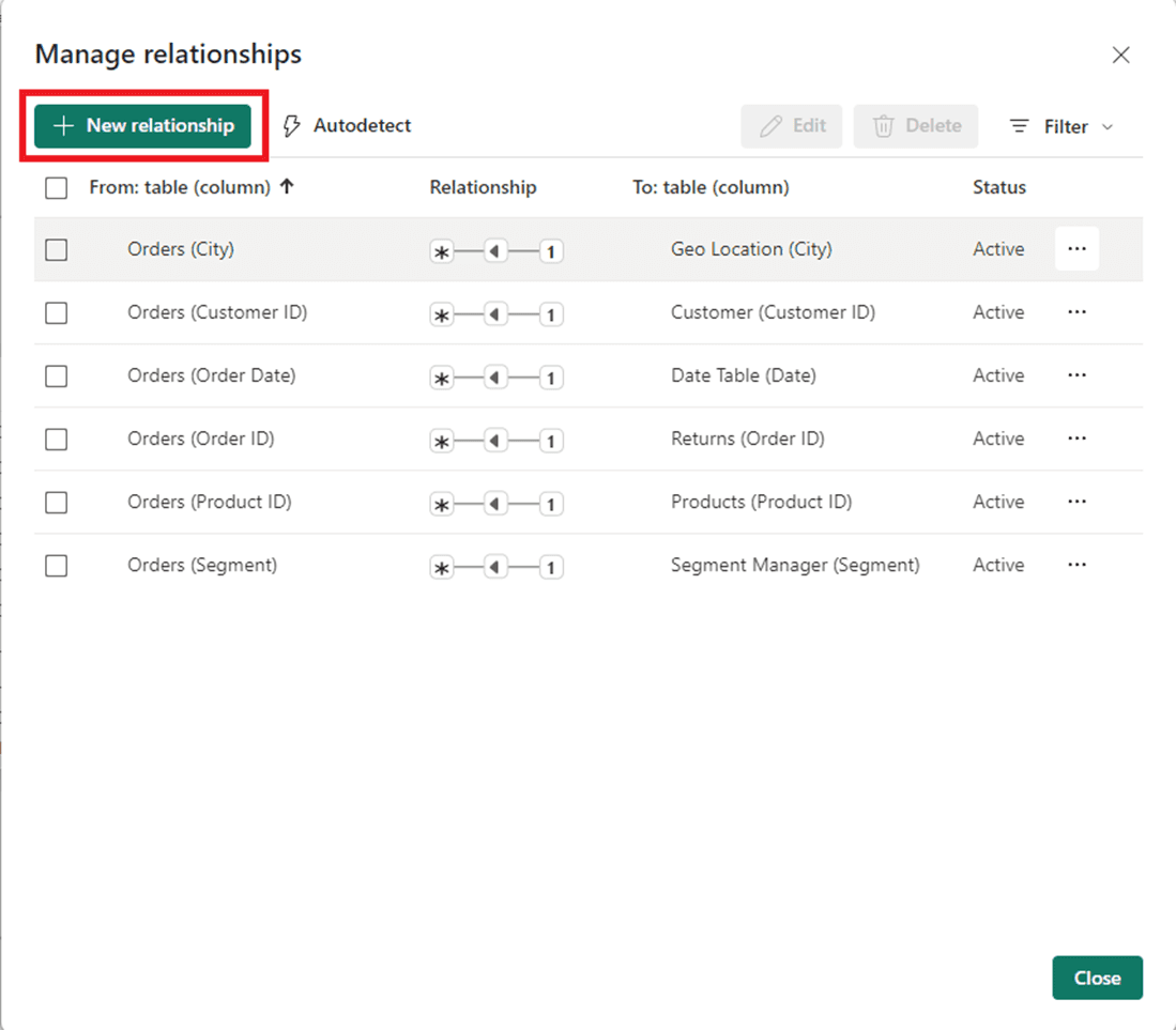 Once the dim and fact tables have been ingested into Power BI it’s time to create the relationships.