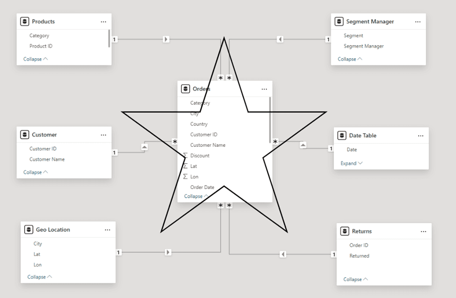 The Star-Schema Data Model is the gold standard technique when modelling data in Power BI. It is recognized by the star shape and has the following characteristics.