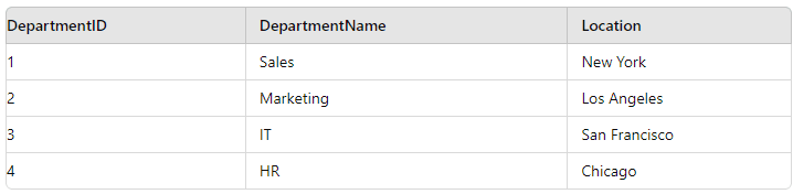 INNER JOIN Departments d ON e.DepartmentID = d.DepartmentID;LEFT JOIN (or LEFT OUTER JOIN) returns all rows from the left table, and matched rows from the right table.