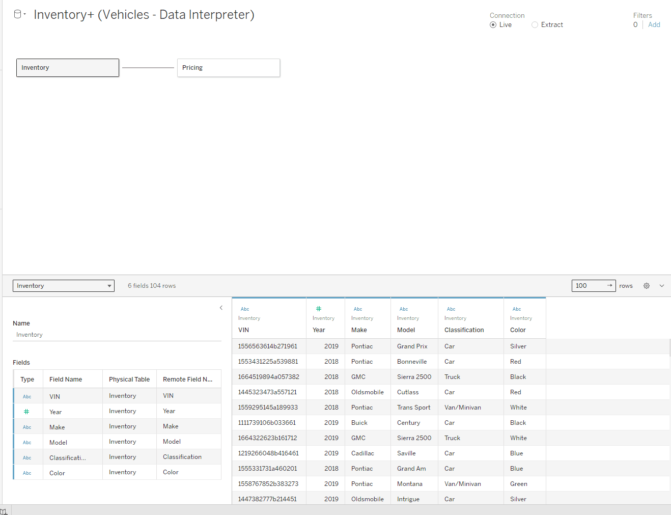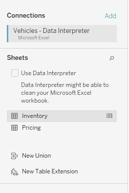 Drag all of your data onto the canvas. Below you can see that it detects a relationship between the two because of a common field, VIN.