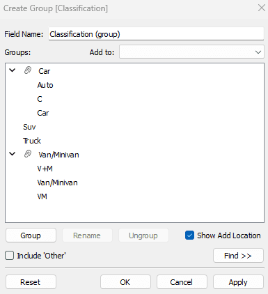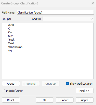 If we knew that C, Car, and Auto were all the same, what we can do is ctrl + click these values, click Group at the bottom, and name the group Car.