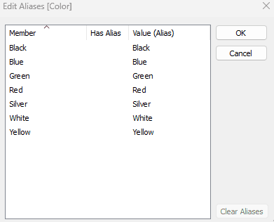 Now let's look at Aliases. Right click on a column, and select Aliases. We can change the value in the Values (Alias) column.