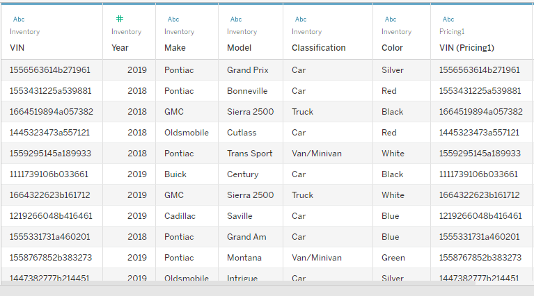 There's no point in having VIN twice, so right click on the column that joined your two datasets and click Hide.