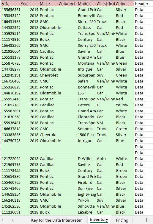 Reading the keys, notice that red is interpreted as a column header, and the green is interpreted as values. If we look at the Pricing tab, it did the same thing. It recognized the columns in the data.