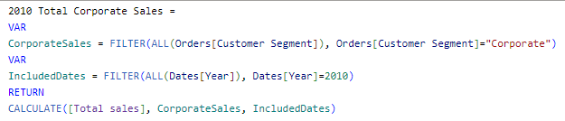 Here we are returning Total sales, filtered by Corporate Customer Segment and the year 2010.