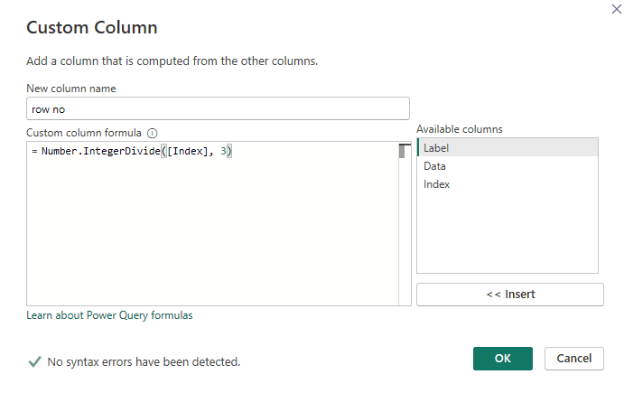 Insert this formula. Here we are saying that we are dividing the Index column by 3. Click OK.
