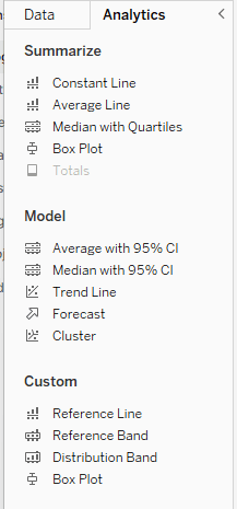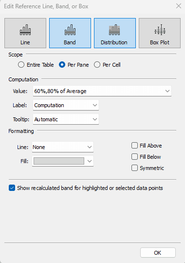 Name the sheet tab "Distribution Band", then go to the Analytics pane on the left. Under Custom, grab the Distribution Band and drop it on Pane (we're going to do a distribution band for each pane).