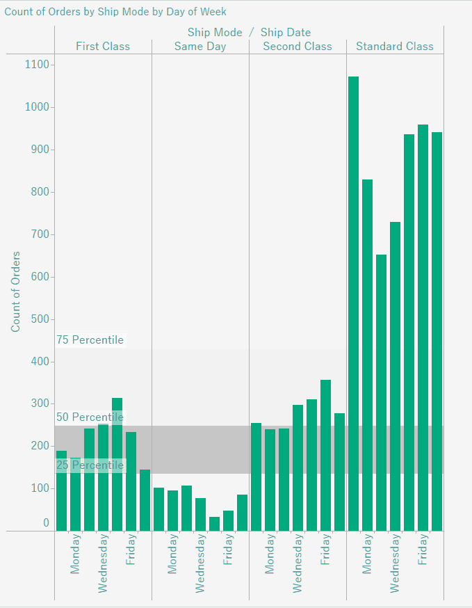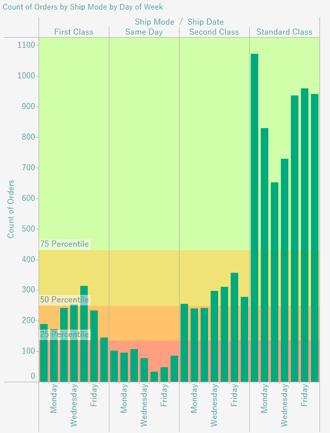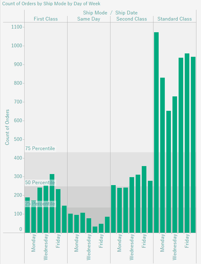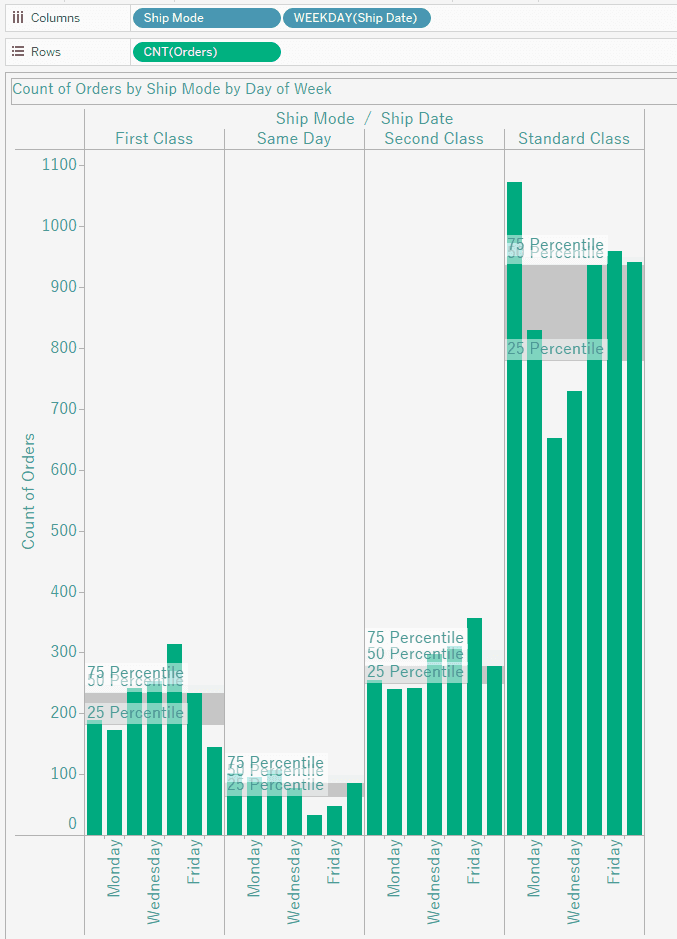 Go ahead and create a new sheet. Drag Ship Mode and Ship Date to Columns. Right click on Ship Date, hover over more, and choose Weekday. Then, drag Orders(count) to the Rows shelf.