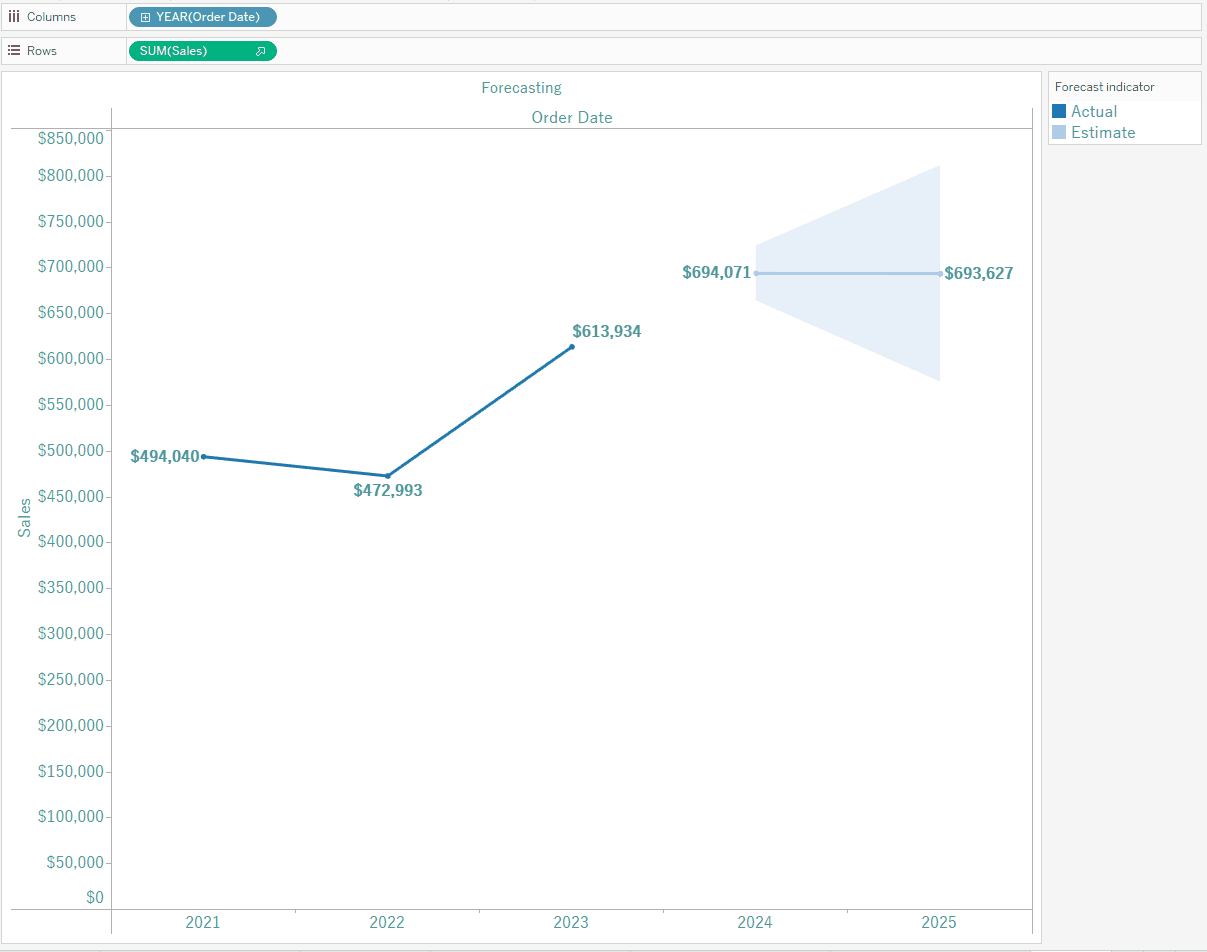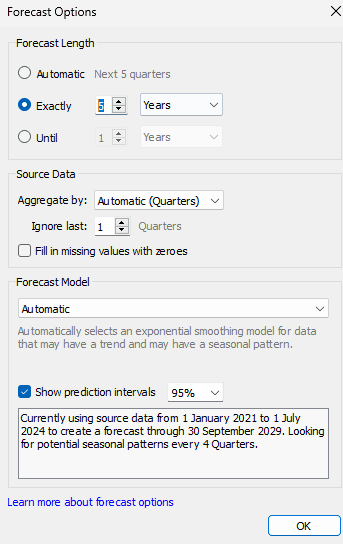 If you hover over your forecast you'll see that we're given two years of a forecast for 2024 and 2025. Let's change that. Right click on the forecast, hover over Forecast, and click Forecast Options. Change the option to Exactly, and make it 5 Years.