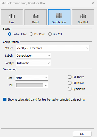If we hover over a distribution band in a pane, we will get different values compared to other panes. If we want to look at the table level what we can do is right click on any of the bands and choose edit, then at the top choose Entire Table.