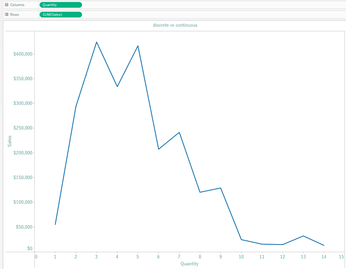 Create a new sheet, putting Quantity in Columns and Sales in Rows. Make sure that Quantity is continuous by clicking on its dropdown arrow and changing it.