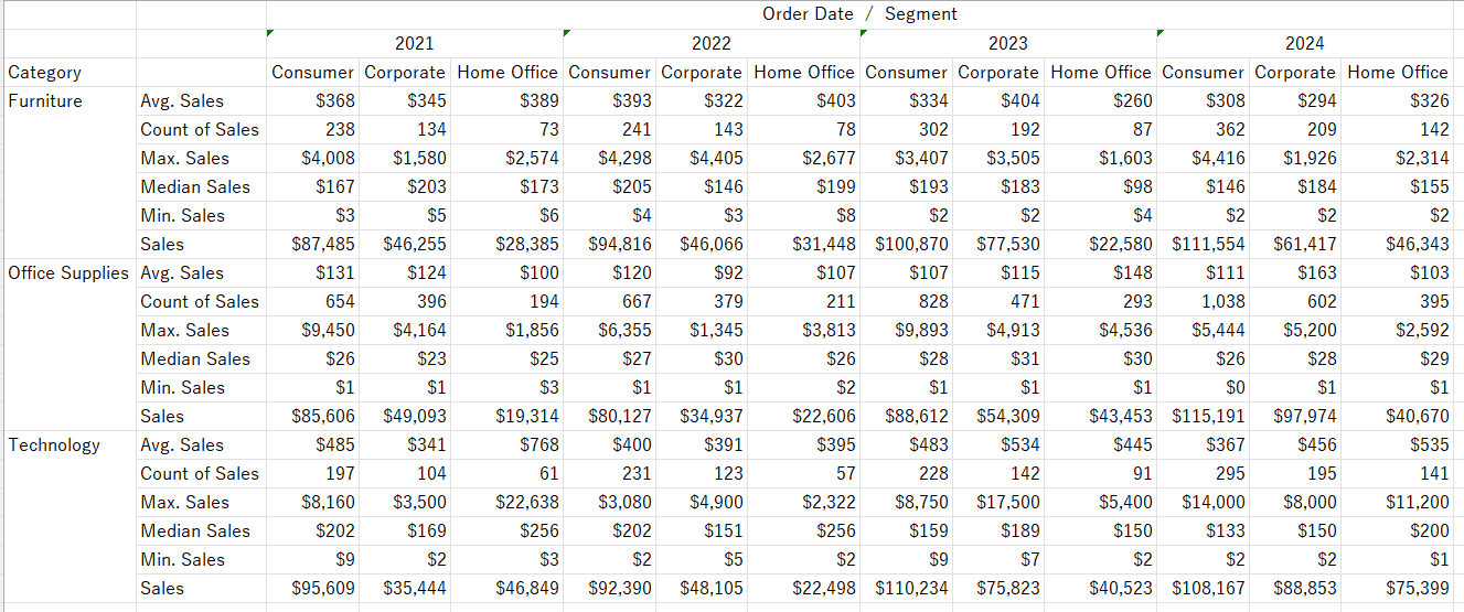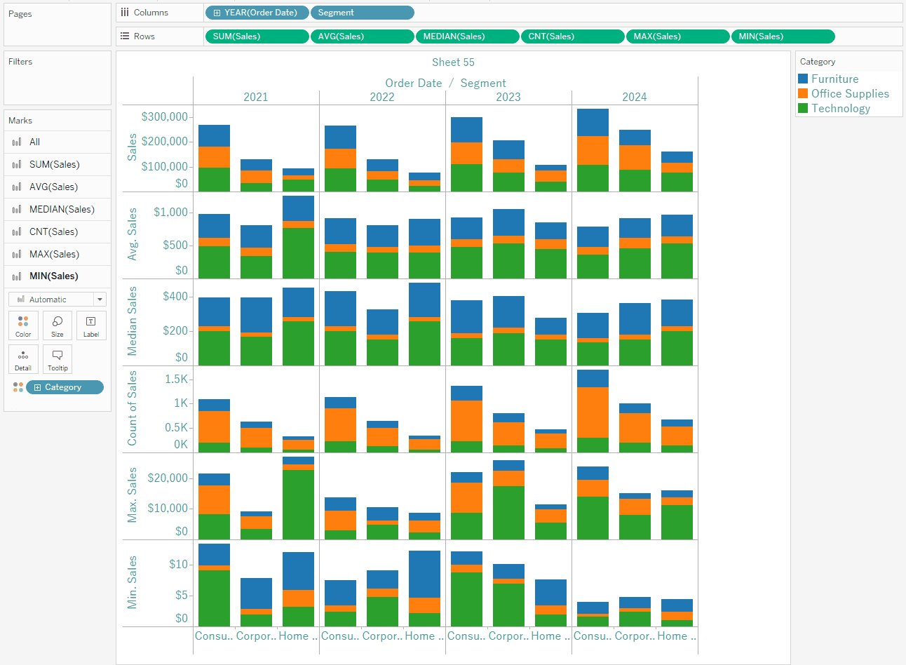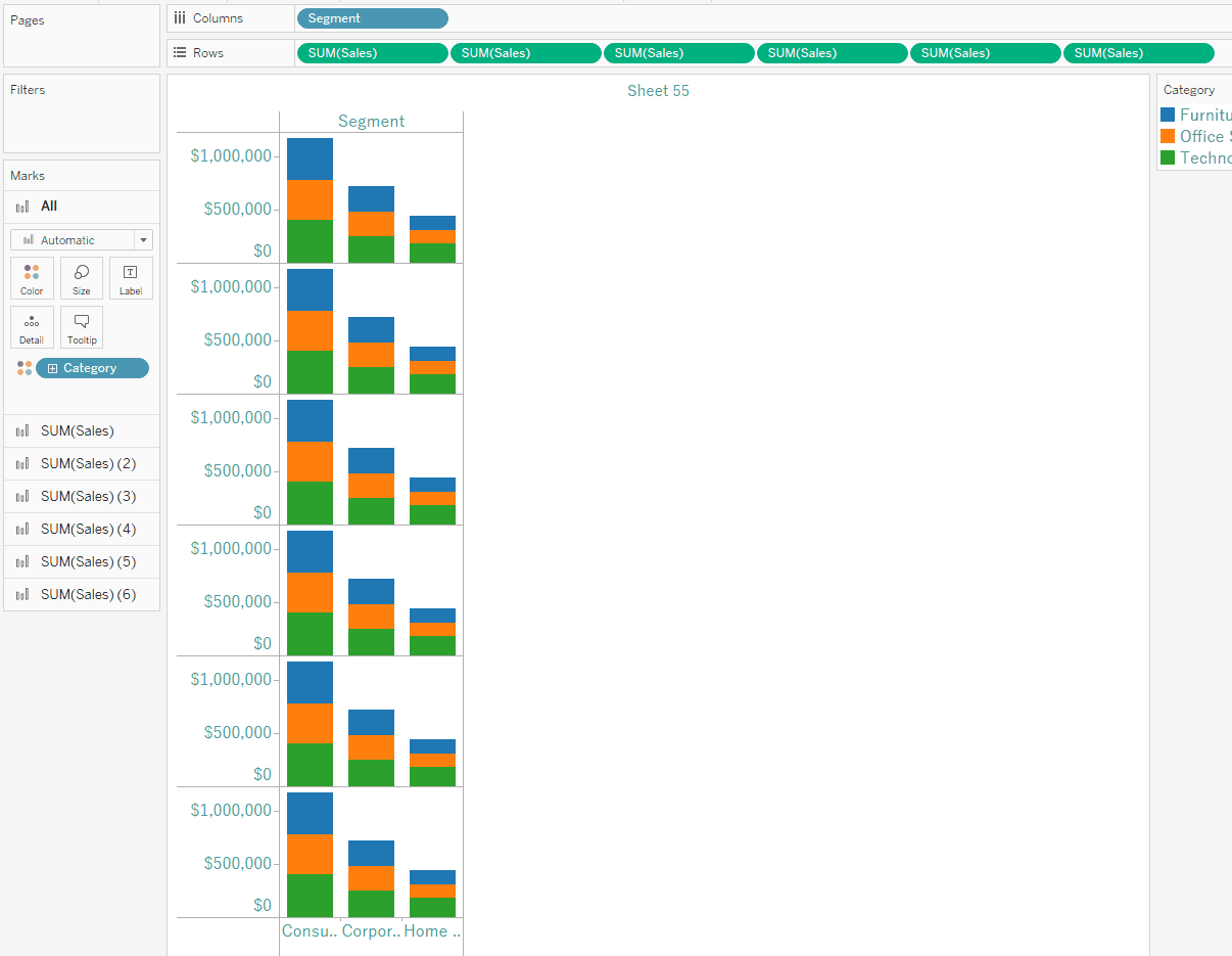 Add Segment to Columns, Sales to Rows six times, and category to Color on the Marks card.