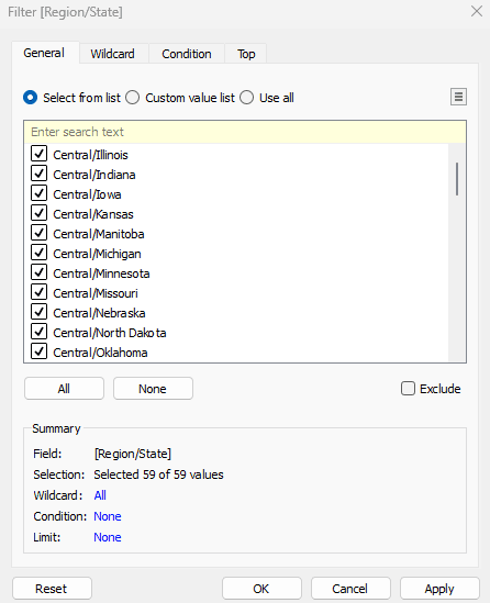Let's drag Region/State to the Filters shelf, select All, then click OK.