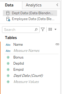 Click on your first data source in the Data pane and add a field to the table. Go back to your second data source and add a couple more fields.
