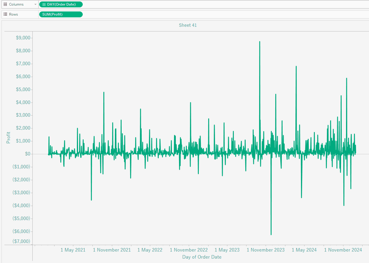 Put Order Date to Columns, and Profit to Rows. Change from YEAR(Order Date) to DAY(Order Date), by clicking on the dropdown arrow and choosing the second Day option.