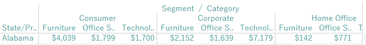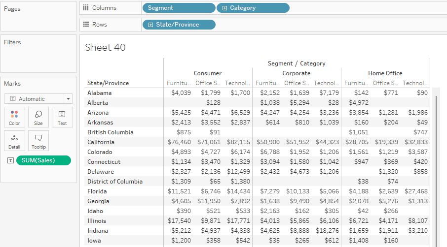 Put Segment and Category in Columns, State/Province in Rows, and Sales in the Text box for the Marks card.